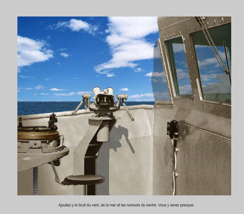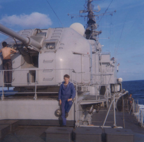 J’imagine qu’à l’arrière ce doit être la même chose. Et ces claquements, lointains et atténués me sortent de ma torpeur. L'activité des canonniers est des plus bruyantes, on ne peut l’ignorer. Ça va durer jusqu’à la fin du quart. Aussi, je finis par ne plus y faire attention. J’attends dix-huit heures. Ça devient long. Depuis trois jours, la météo s’est adoucie, le balancement dû au roulis devient presque imperceptible. A moins que l’habitude arrive ? Peut-être. Dès que l’occasion se présentera, je ferai donc un tour dehors. Cela fait un moment que je n’ai pas vu le ciel, ça me changera. En attendant, on parle, échange de lieux communs, des bars et des discothèques à Brest et alentours. J’entends parler de La licorne, la clé des champs à Plougastel, le flash-back, fort Knox, ça ce sont les discothèques, je ne les connais pas encore et pour cause. J’aurai largement le temps de me rattraper plus tard. Le quart n’en finit pas, maintenant, je baille, somnole.