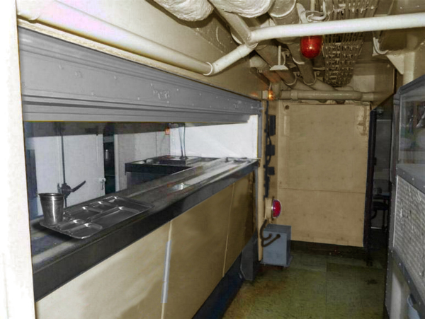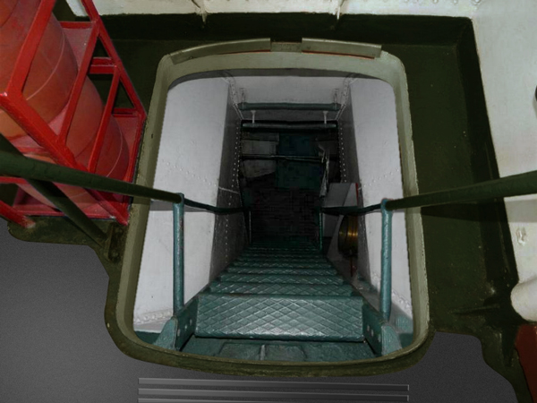 Retour dans la coursive, il y fait presque froid, et comparé au bruit d’en bas, ça frise le silence monacal. On avance toujours vers l’arrière, passage de plusieurs portes étanches restées ouvertes (Fermées au poste de combat) on descend vers le poste 4 qu’il me tarde de rejoindre pour y retrouver ma bannette. On n’y entre pas, on descend encore pour y faire d’autres relevés dans le local calcul du Malafon.