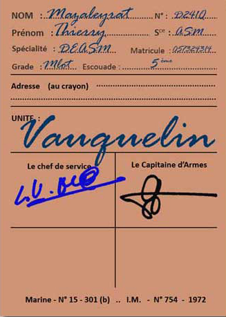 Je montre ma feuille d’affectation et me présente. L’insigne de manche du second-Maître est le même que le mien à part la couleur. Je suis déjà en famille, si je puis dire ! Il se présente à son tour puis demande au planton de me mener au BSI afin que le Capitaine d’arme (plus couramment appelé Bidel) démarre la procédure d’embarquement. Le BSI du bord me paraît minuscule comparé à celui de l’école de Saint Mandrier. Un minuscule local limite placard à balais face au coiffeur où l’on ne peut tenir à plus de trois personnes et une machine à écrire.