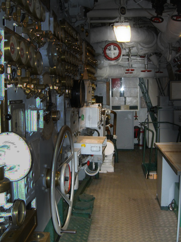 Quatre ou cinq mètres plus bas dans un vacarme épouvantable, me voici au royaume des « Bouchons gras » Quelques quartiers-maîtres, matelots, second-maîtres et un patron en face d’un immense panneau couvert de cadrans et manettes en tous genres, le tableau de commande machine AV se parlent en hurlant.