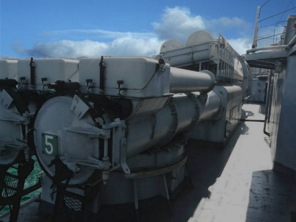Ces locaux toujours réfrigérés sont une vraie plaie quand il faut y pénétrer sans blouson de mer. Je le saurai la prochaine fois. Retour dans la coursive, le collègue ouvre une porte étanche pour accéder à la plage arrière. Un peu d’air frais ! Gaste ! Ça faisait un moment que je n’avais mis le nez dehors. Un vent fort accompagné d’embruns nous accueille. La nuit est claire mais je ne vois pas la lune. A côté du bruit incessant de l’intérieur, c’est presque reposant de n’entendre que la mer. Je n’ai pas encore le temps d’en profiter, je dois suivre mon guide qui n’a manifestement pas l’intention de lézarder. On contourne la rampe de lancement du Malafon et procédons à l’inspection du mécanisme du sonar remarqué. Le gros poisson blanc repose sur son berceau. Tout va bien. Et pour terminer, un tour dans le hangar Malafon. Le projectile d’entrainement sur le berceau de transfert, les autres (ceux de guerre) dans leurs alvéoles. Là encore tout va bien. Relevé de l’hygrométrie puis retour au PCASM.