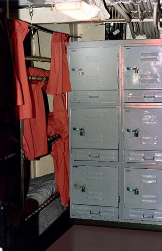 Il est midi passé, dès la relève assurée, je ne me suis pas fait de vieux os au PC, je suis allé faire la queue à la caf. Quittant le quart, j’arrive au dernier service. Les tables sont maculées des débordements de plateaux repas. Le roulis y est pour beaucoup, mais ce n’est rien à côté de ce qu’il y aura lors de grosses tempêtes. Mais là aussi, j’y reviendrai. Mes agapes terminées, un petit stage à la bannette sera le bienvenu. Dans les travées, entre les bannettes, quelques gars jouent à des jeux de société, d’autres lisent, d’autres dorment. C’est ce que je vais faire. Quel bonheur que de pouvoir retourner se vautrer sur son pieu ! Pour cette fois, le roulis est agréable mais pas nécessaire pour s’endormir.