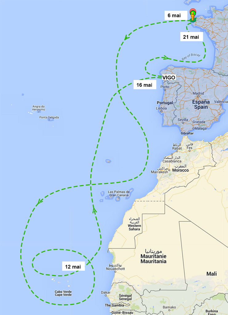 Au matin du 16 mai, le Vauquelin croise au large de l’Espagne et se dirige vers la baie de Vigo.