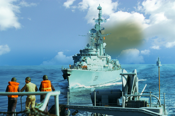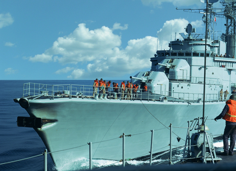 Le poste de ravitaillement avec le Duguay Trouin est presque un exercice de style tant les conditions météo sont clémentes. De la plage arrière, où mon tiers est à poste, je contemple le Duguay Trouin se rapprocher. Il pousse un peu la machine pour se mettre au niveau du Vauquelin. Des volutes de fumée brune s’échappent par instants de ses cheminées. Puis ralenti doucement pour rester à couple.