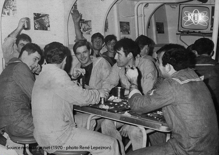 Le passage à Gibraltar se fera encore de nuit. Je suis de quart et profite de l’occasion pour faire un tour à la passerelle. Même s’il n’est pas nécessaire de jouer de la gaffe entre les continents, le temps est clair et il est possible d’en apercevoir les lumières à l’horizon. Il faudra encore deux jours de navigation pour apercevoir les côtes Bretonnes. Sous un ciel gris et un crachin tenace, le navire entre dans la rade. Le Vauquelin restera à quai pendant la période des fêtes. Aussi les demandes de permissions vont aller bon train. J’attendrai la semaine après Noël pour partir en permission. Aussi, je passerai le réveillon à bord. J’ai le souvenir que les repas de fêtes étaient mémorables. Mis à part les inévitables plateaux, le repas en valait la peine. Ne dit-on pas que les cuisiniers de la marine sont les meilleurs des trois armes ? Ce ne doit pas être faux. Je n’ai jamais eu à m’en plaindre. Deux jours avant Noël, la cafétéria est décorée de guirlandes. Ce jour-là, je suis de service, et à part les gens dans mon cas, il ne reste pas grand monde à bord. Il est dix-huit heures, mon quart à la coupée est terminé, je vais faire un tour à la caf voir la télé. C’est un poste en noir et blanc, je me souviens. Il était posé en hauteur, sur une étagère, au fond de la cafétéria. Ce poste fonctionnait que lorsque le navire était à quai. A la mer, les contraintes de service ou de réception en interdisaient l’usage. Je m’installe à une table et essaie distraitement de m’intéresser à l’émission en cours. Autour des tables, ça discute, ça fume, ça commente les sujets qui défilent à la télé. En clair, on attend l’ouverture de la rampe.