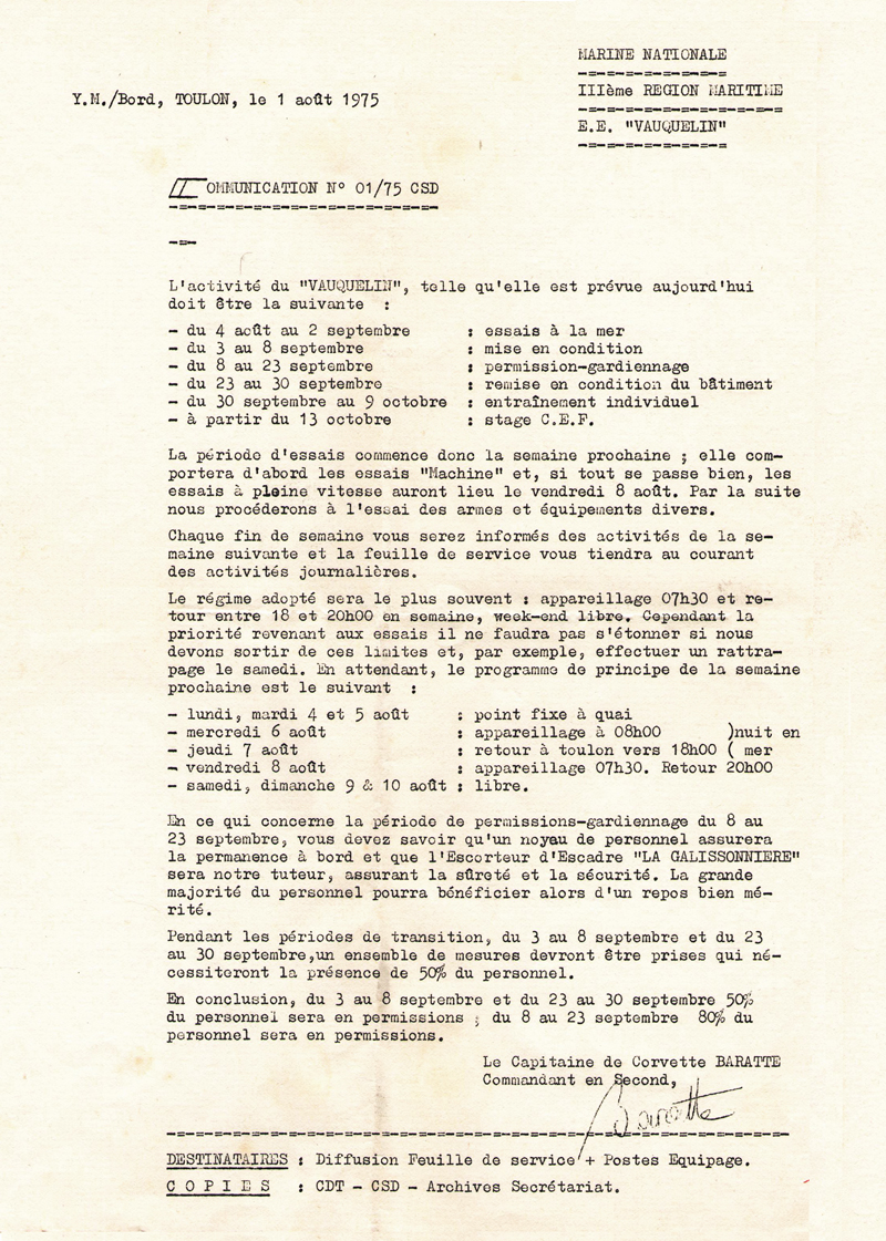 Le retour à Brest n’est pas pour tout de suite. De longs réglages à la mer amèneront d’interminables exercices et ronds dans l’eau en Méditerranée avec le Duguay Trouin et le Du Chayla. Ça changera du golfe de Gascogne.