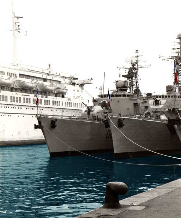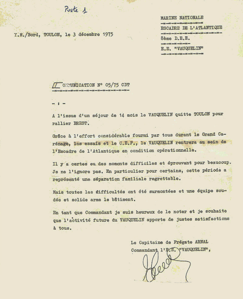 Le Vauquelin réintègre la 8ème Division d’Escorteurs d’Escadre début décembre 1975 mais ne regagnera le Finistère que le 19 décembre. Les adieux à Toulon seront sobres, l’appareillage se fera dans les règles. Cette fois encore, je ne suis pas de quart, donc au poste de manœuvre. C’est bien ainsi, je vais voir une dernière fois défiler la côte Varoise. C’est un après-midi relativement doux pour la saison. Mais le blouson de mer n’est pas superflu. La presqu’ile de Saint Mandrier est à peine dépassée, que le dégagé du poste de manœuvre est envoyé. La plage arrière est maintenant déserte. Je reste et regarde la côte s’éloigner. Ces quatorze mois à Toulon sont passés très vite, je me sens très bien à bord et ne regrette pas d’être resté à quai plusieurs mois. En juillet, je passe Quartier Maître deux sardines sur les manches. Je ne sais plus si j’ai fêté cet événement, c’était aussi le mois de mes dix-neuf ans et vingt mois d’embarquement.