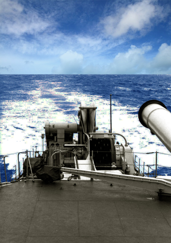 "Rompre du poste de manœuvre. Le premier tiers étant de quart"Voilà, c'est reparti ! La côte est désormais comme un fil brun à l'horizon. Le navire va bon train sur une mer plate. Les seuls bouillonnements visibles sont ceux laissés par le sillage du Vauquelin. La plage arrière est maintenant déserte. Une plage arrière recouverte d'une peinture neuve. Pas un point de rouille. Le résultat des longues journées à piquer la rouille et la vieille peinture.