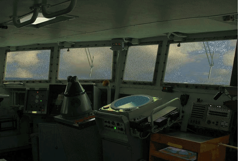 Au PC ASM , les commentaires et impressions échangées vont bon train, sous l’œil goguenard des anciens. La quiétude du PC tranche tellement avec la pagaille organisée de tout à l’heure. C’est une bénédiction de se retrouver assis devant le scope du sonar. C’est le repos absolu. J’en souhaiterai presque de trouver un écho suspect et déclencher une alerte pour digérer les évènements passés. Ça n’aura pas lieu. La paix habituelle revient peu à peu. La relève ne va pas tarder, je vais faire un tour à la passerelle prendre ma dose de sérénité. Au passage, je distingue un enseigne de vaisseau qui porte les stigmates de l’évènement. S’il a fait la Jeanne, il a dû déjà connaître les douceurs liées à ce genre d’intronisation. Seule différence, pour l’équateur, la météo, en général le permettant c’est plus long, plus structuré et ça se passe en extérieur. Si non, c’est sans doute un appelé. Derrière les vitres, la mer est déchainée, et, soit dit en passant aucun iceberg à l’horizon… Les essuies glaces passent leur temps à balayer les embruns ; Les radars de navigation sont plus que jamais nécessaires, dehors, on ne voit rien.
