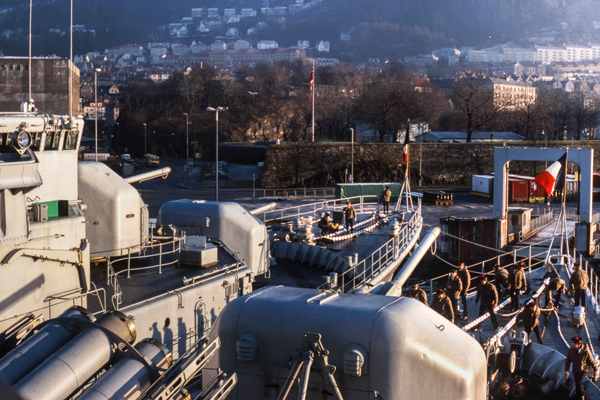 Mise à part la climatisation et le ronronnement des diésels pas de bruit. Même chose au poste. La lumière en moins. C’est à tâtons que je vais à ma bannette, j’y grimpe, et m’entortille dans le dessus de lit… Le vacarme des premiers permissionnaires de retour à bord, puis l’annonce du deuxième service me sortent de mon sommeil, il est bientôt dix-huit heures. L’après-midi est vite passé. Je me fais un peu violence pour me tirer du lit, laisser la tenue de sortie et repasser le treillis. Le blouson de mer sur le dos, je vais me dégourdir les jambes plage arrière. Le temps de m’acclimater au froid et faire attention à ne pas glisser, je reprends peu à peu mes esprits. Il fait déjà nuit. Le navire est éclairé comme un sapin de Noël, même chose pour le Duguay-Trouin. De l’autre bord, c’est le fjord. C’est le noir, je n’y vois rien. Si ce n’est quelques points de lumières sur l’autre rive et les feux de position de quelques ferries. L’eau clapote à peine. En mer, ce n’est surement pas la même musique. Je retourne au poste déposer mon blouson, et à la caf diner… Je reprends le quart à minuit, je serai donc réveillé juste après m’être endormi, à la coupée jusqu’à quatre heures, puis re-bannette jusqu’au branle-bas à sept heures. La nuit sera courte et intermittente. D’où l’intérêt de ne pas trainer. A cette heure, la coursive est plus animée. Ce sont encore des permissionnaires qui rentrent à bord, quelques-uns vraiment très fatigués…