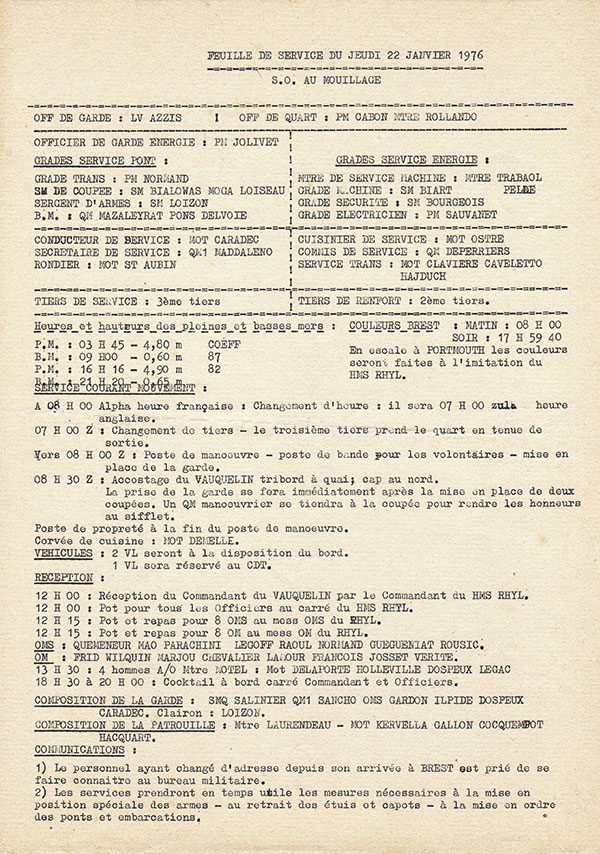 Il est bientôt huit heures, et c’est d’un pas trainant que je me dirige vers le bureau des mouvements. Capeler les guêtres est une épreuve, j’ai du mal à me plier pour les lacer, le ceinturon c’est plus facile à mettre en place. Passé neuf heures, le Second-Maître de coupée de demande de lancer l’appel des permissionnaires, ce que je fais d’une voix que je veux officielle et posée… J’ai à peine raccroché le micro, que déjà, le monde afflue pour passer sur le roof Malafon. L’inspection terminée, les gens repassent déposer leur carte de bord dans le pupitre, saluent la poupe, passent sur le Duguay-Trouin, puis vont prendre leur dose de terre ferme. Le calme est revenu, il ne me reste plus qu’à attendre midi… Qui tarde à venir. Je me promets d’aller faire une sieste sitôt le déjeuner avalé. Mais en attendant, le devoir s’impose. Une bise glacée balaie le pont emportant des volutes de neige, je me colle le dos contre la paroi pour échapper au courant d’air. En milieu de matinée, le bidel me donne un paquet de feuilles de service à distribuer dans le bord. J’en prends d’abord connaissance. Il y est dit, entre autre que le Vauquelin larguera les amarres demain à treize heures, par conséquent, Il n'y aura pas de permissionnaires.