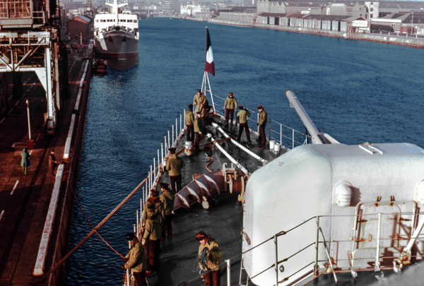 L’appel au poste de manœuvre est lancé à huit heures, en tenue de sortie avec le blouson de mer. Sur le roof Malafon, une garde d’honneur est mise en place. Le second-maître sacco avec cinq gars du service intérieur sont alignés sur tribord. Les docks défilent lentement, peu de gens sur les quais. Nous sommes en décembre, aussi la météo ne se prête guère à la promenade matinale. Ordre est donné de préparer les aussières. Le quai destiné à l’accostage est proche. Je le vois. Il ne diffère guère de ceux qui ont précédé. Les lance-amarres entrent en action, les aussières glissent le long du bord, plongent dans l’eau froide, puis remontent vers le quai tirés pas le mince filet envoyé sur l’appontement par le lance-amarre. Le navire se colle doucement aux défenses le long de l’embarcadère, les aussières se tendent. Le poste de manœuvre se termine. J’ai froid je n’éprouve pas d’excitation propre à l’arrivée dans un port inconnu. La fatigue peut-être. De toute façon, je ne descendrai pas à terre aujourd’hui, je suis de service.