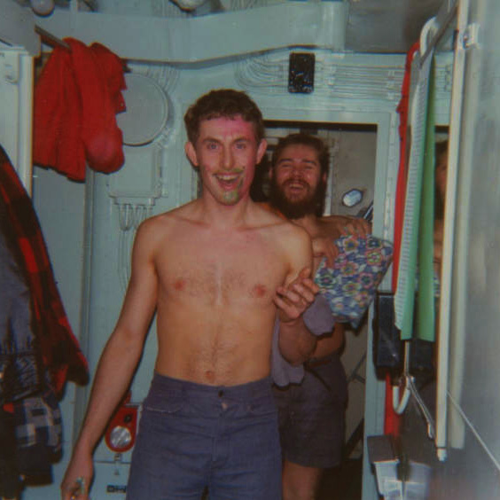 C’est donc en Schtroumpfs que nous sommes introduits dans la caf. Le lieu est radicalement transformé. Des draps sont tendus un peu partout et au fond, assis sur une chaise posée sur une table l’adjudant de compagnie sous les traits de Neptune, une couronne sur le crane un trident dans une main, les pieds nus tartinées de mayonnaise posés sur un plateau. Avant d’y arriver, il faut attraper avec les dents une pomme au fond d’un seau rempli d’eau. Ceci fait, sous les huées des « examinateurs » choisir deux fils électriques sur quatre ou cinq présentés en espérant que les fils sélectionnés ne sont pas reliés à la dynamo fiévreusement actionnée par un électricien. Je ne sais plus s’il y avait d’autres épreuves à passer avant de faire ses dévotions à Neptune. Toujours est-il que ces ferveurs consistaient à pieusement embrasser ses pieds à la mayonnaise. Tout cela dans une mêlée confuse et précipitée dûment agrémentée par les sursauts et les roulis du navire. Pendant quelques jours encore, il sera possible de reconnaître les nouveaux baptisés. Les traces de bleu mettront du temps à se dissiper. Après quoi, j’aurai juste le temps de prendre une douche et me changer avant d’aller prendre mon quart.