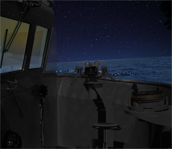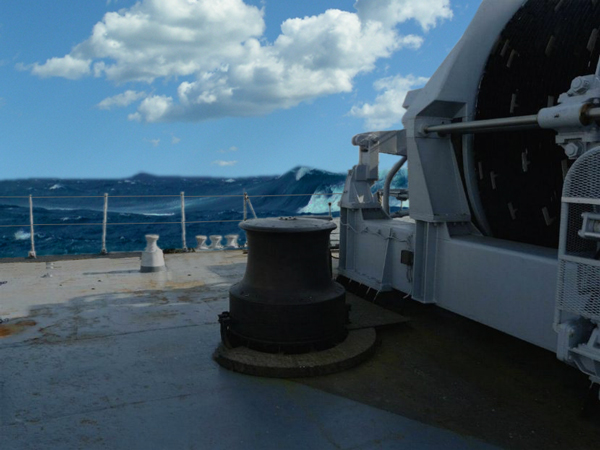 Passé mon temps de quart, je vais faire un tour à la passerelle. Dehors, le temps s’est assombri, le ciel est plombé, la mer se creuse. La proue est régulièrement submergée d’embruns. Sur les ailerons, les guetteurs sont frigorifiés. Le bonnet de mer descendu jusqu’aux oreilles, le col du blouson remonté de la même manière. Ils ne sont pas à la fête.