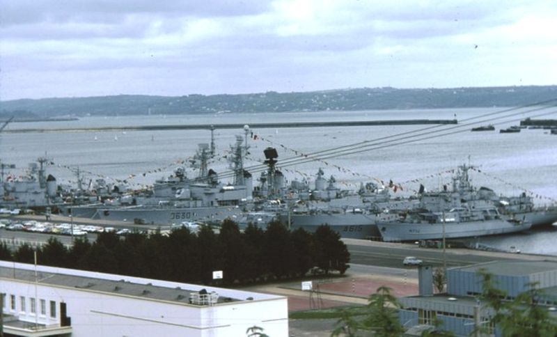 Le Vauquelin contourne l’ile par l’ouest et s’engage vers les passes. J’ai à peine eu le temps de prendre le petit déjeuner, après mon quart, A huit heures, le poste de manœuvre est envoyé. C’est au pas de course que je retourne au poste 4 me changer. Et il se fait en tenue de sortie. Ce qui comme d’habitude en pareil cas ne facilite pas la manipulation des aussières. Arrivé plage arrière, je peux déjà apercevoir sur tribord les maisons, les docks et aussi les voitures et les gens évoluer sur la route du bord de mer. Puis le port de plaisance, les ferrys. Et enfin les premiers bâtiments de la Royal Navy à quai.