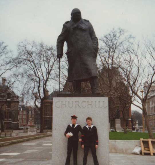 C' est un car qui a été affrété pour nous mener à Londres De fait, nous nous trouvions transformés en touristes. Aussi, le trajet s’est effectué dans une atmosphère assez festive. Lâchés en centre-ville, avec pour consigne de se retrouver à ce même endroit en début de soirée pour le retour. Je ne me souviens de rien de cette journée. Plus tard, j’ai bien retrouvé des photos, mais cela n’a pas permis de me rafraichir la mémoire. Sur ces photos, je me trouve avec un collègue devant une imposante statue de Churchill, et sur une autre à faire le clown dans une rue. Pas de quoi s’émouvoir.